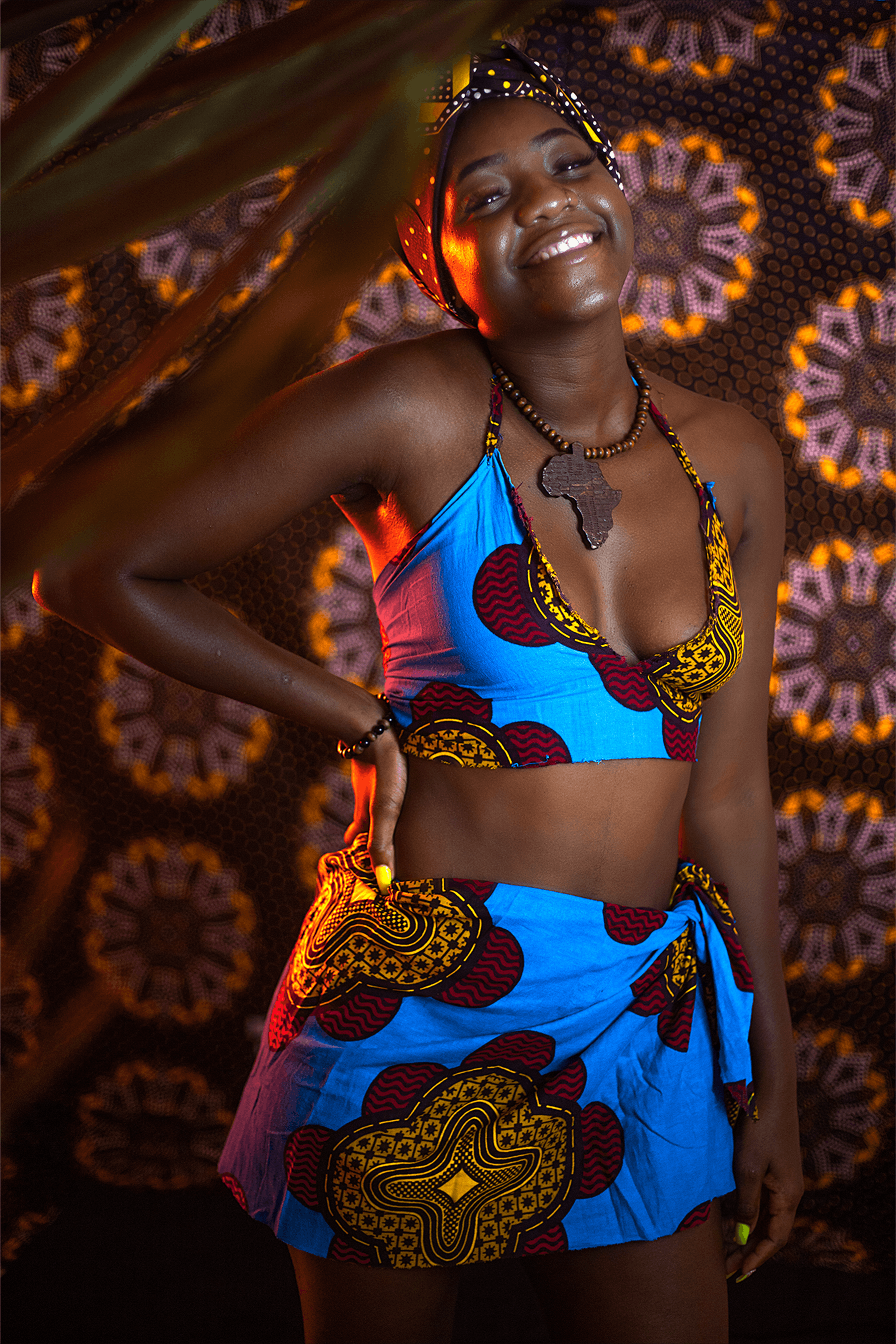 L'influence africaine se manifeste dans le choix de nos tissus : mousseline, soie, coton associés à des motifs africains vibrants. Les accessoires de séduction africains, tels que les bijoux, viennent sublimer chaque création.